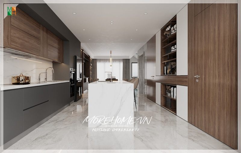 Là một trong những xu hướng thiết kế nội thất nổi bật trong những năm tới, thiết kế phòng bếp hiện đại tôn lên vẻ đẹp mộc mạc nhưng không kém phần sang trọng của gỗ điển hình là gỗ óc chó veneer . Loại gỗ rất được ưa chuộng trong các siêu xe bởi vẻ đẹp ấn tượng từ vân, màu gỗ. Như trong ý tưởng bố trí phòng bếp tại biệt thự Vinhomes Imperia Hải Phòng, sự hài hòa tôn lên nét đẹp giữa truyền thống và hiện đại, tủ bếp dưới gỗ óc chó veneer và tủ bếp trên acrylic trắng bóng.
