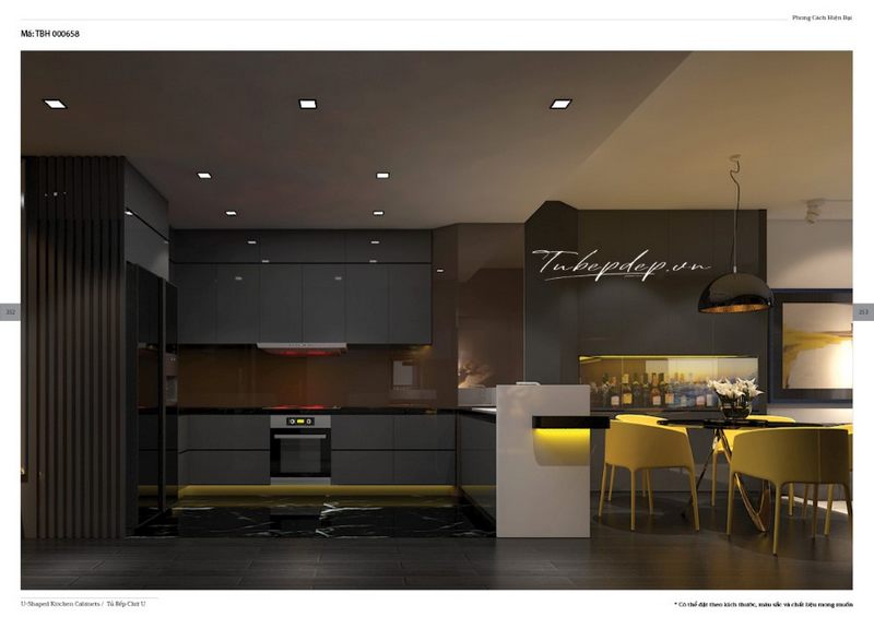 Gợi ý thiết kế phòng bếp hiện đại dành cho biệt thự, nhà phố, chung cư cao cấp có tủ bếp acrylic xám bóng cùng bộ bàn ăn vàng với sự kết hợp 2 tone cực hot trong những năm gần đây