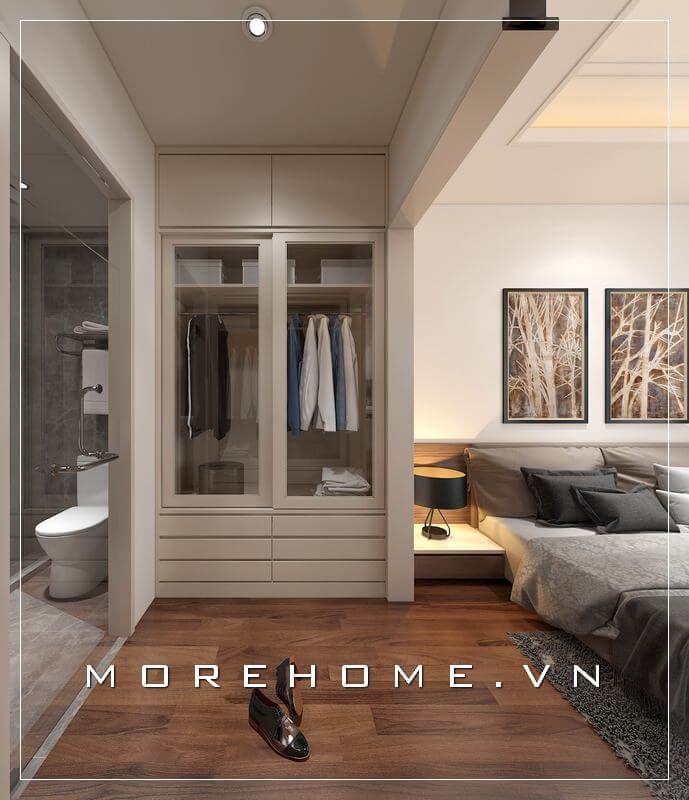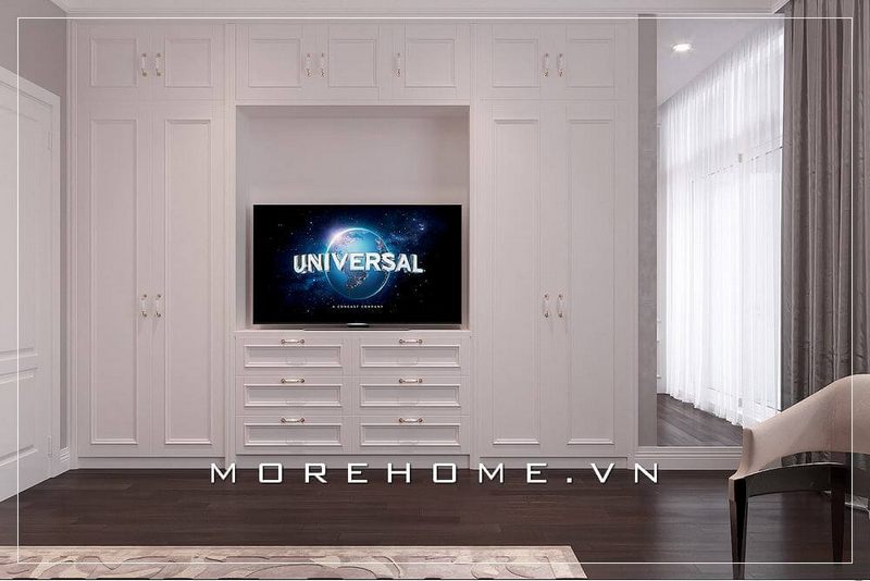 Tủ quần áo gỗ công nghiệp được thiết kế hiện đại, gam màu trắng tinh tế đồng nhất với không gian tạo sự liền mạch cho cả căn phòng