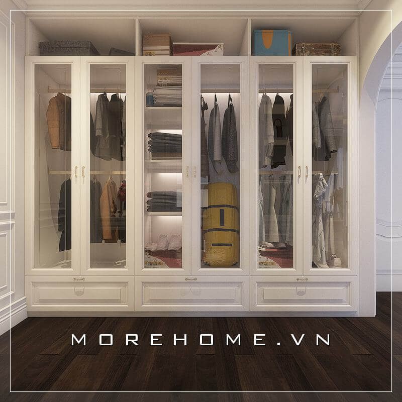 Thiết kế tủ quần áo gỗ ấn tượng với gam màu trắng chủ đạo mang đến cho gia chủ một không gian sang trọng, tinh tế
