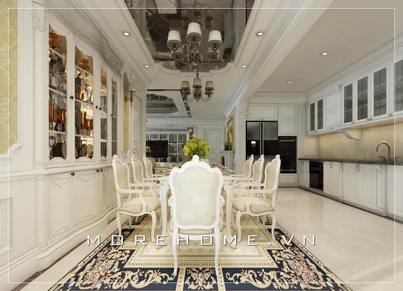 Mẫu tủ bếp có màu trắng tân cổ điển với chữ i đẹp mắt sẽ là lựa chọn tuyệt vời cho phòng bếp của biệt thự.