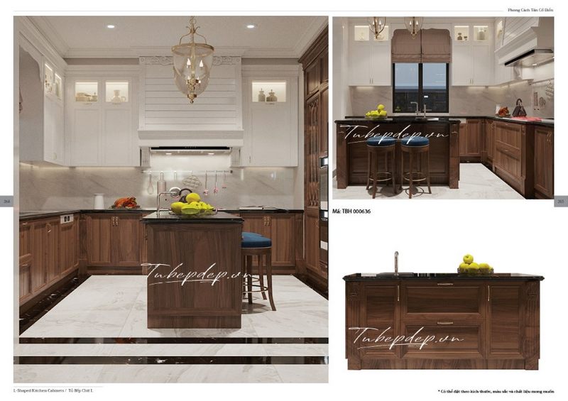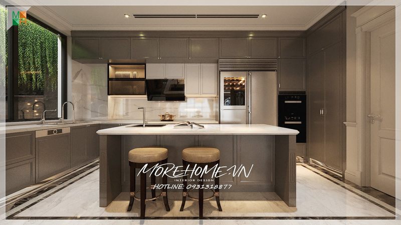 Kiến trúc sư đã thiết kế phòng bếp biệt thự, nhà phố tân cổ điển với bàn đảo làm từ gỗ óc chó nâu vân sang trọng, mặt đá đen tinh tế, độc lập với các nội thất khác trong căn phòng.