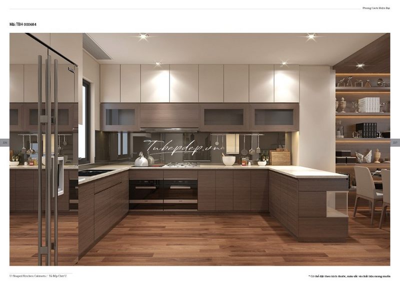 Ngắm nhìn mẫu thiết kế phòng bếp hiện đại có phong cách sang trọng với hệ thống tủ bếp 2 tầng màu trắng - nâu, giúp bạn có thể thấy được tính tỉ mỉ của các kiến trúc sư Morehome.