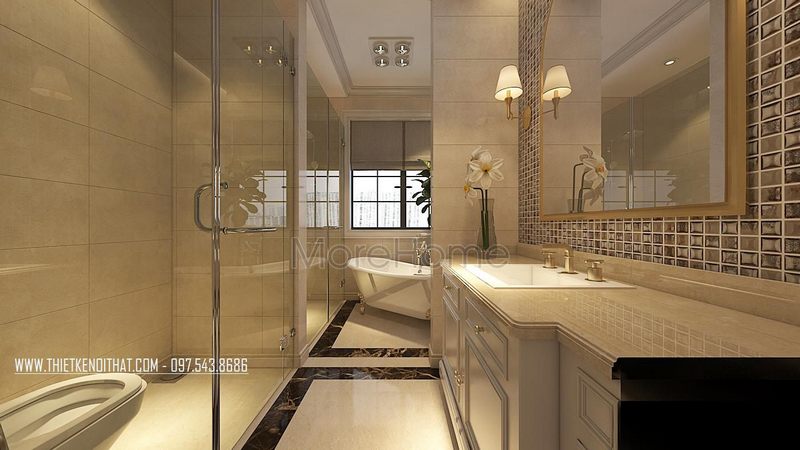 Tủ lavabo mặt đá trắng gỗ tự nhiên màu trắng tân cổ điển với đường nét đơn gian tiện lợi cung cấp một nơi lưu trữ an toàn cho những đồ dùng cần thiết trong phòng tắm với ngăn nắp gọn gàng.